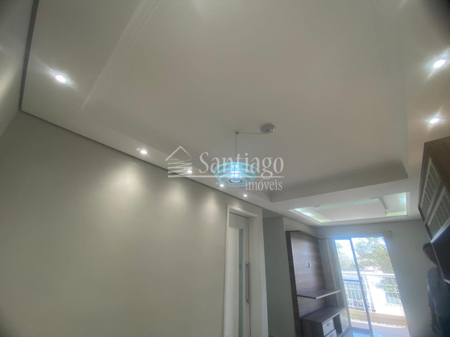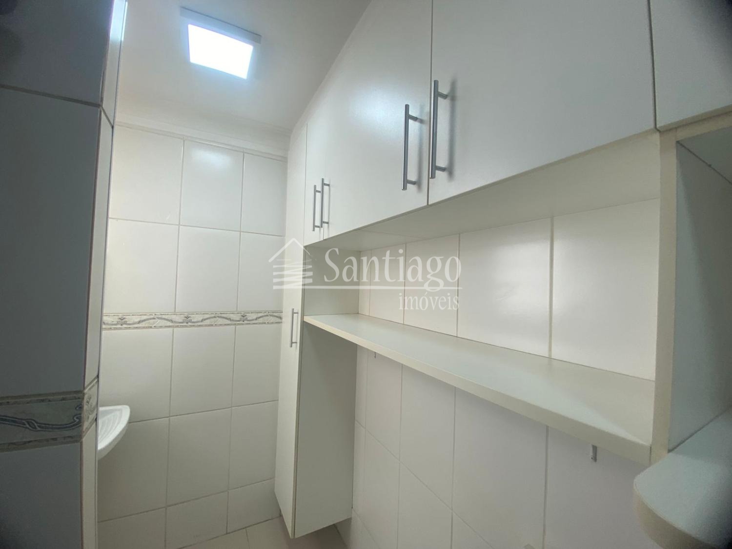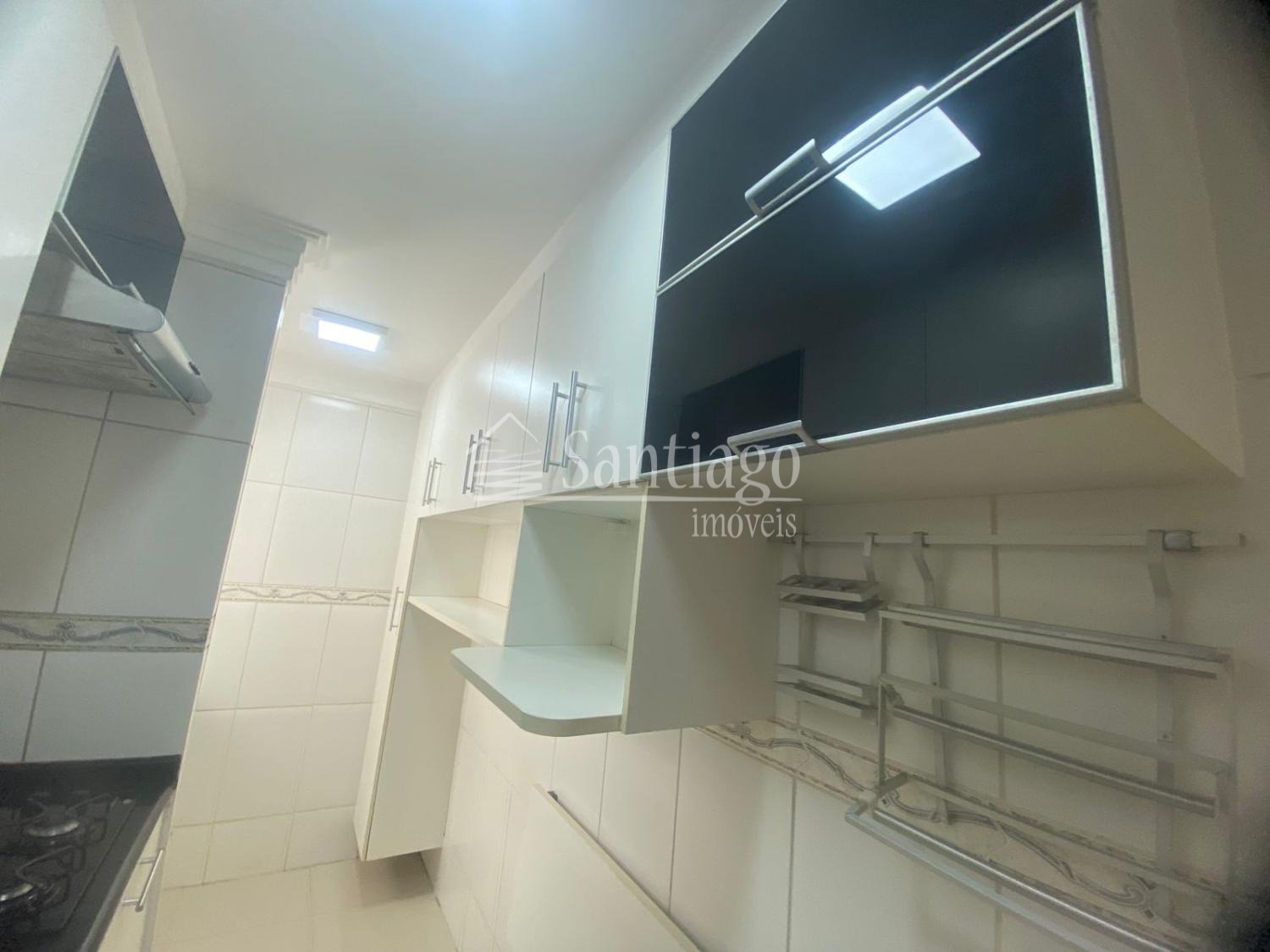 Sala 2 ambientes, cozinha, 2 quartos com armários, 1 banheiro e 2 vagas de garagem.