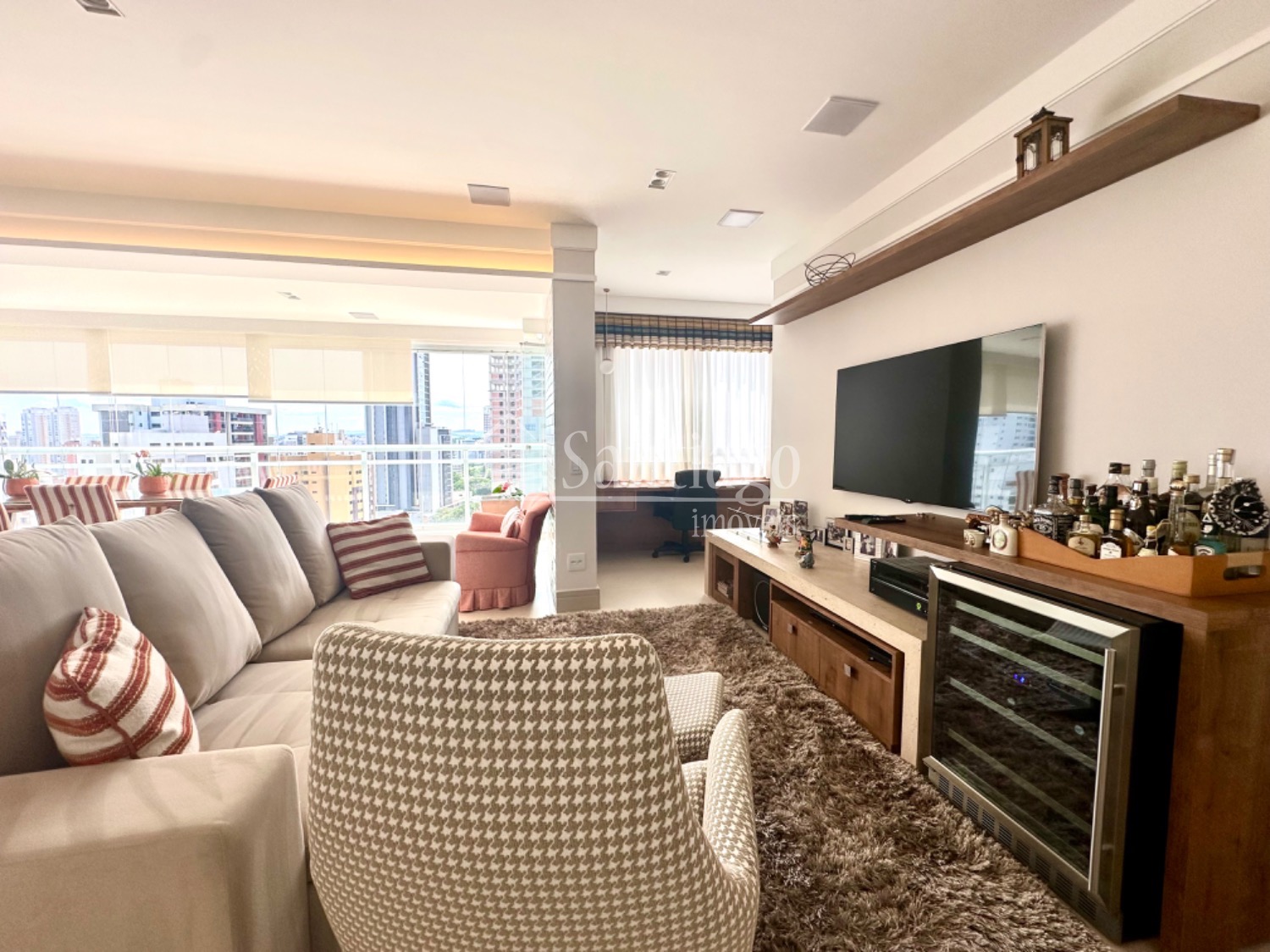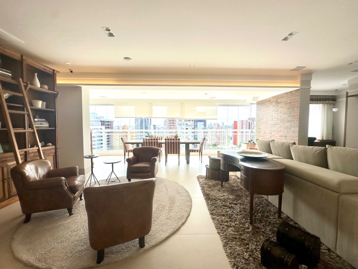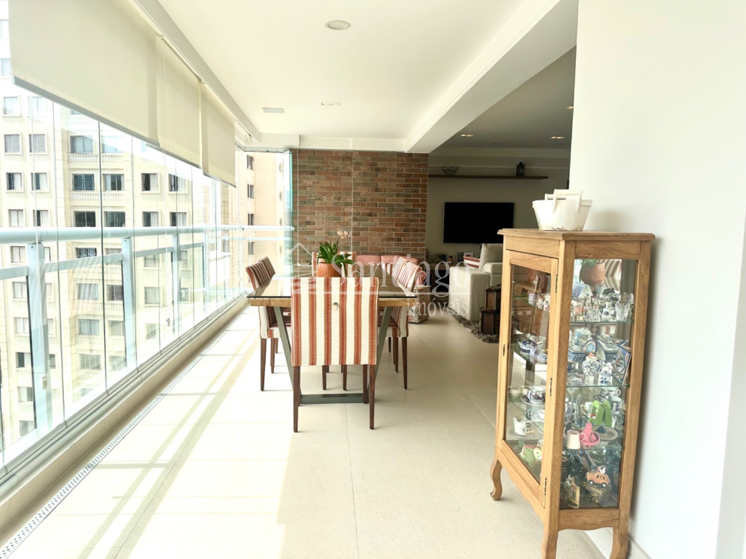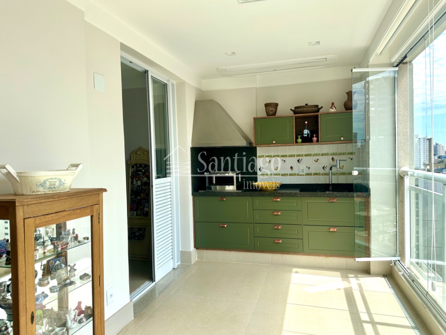 A área gourmet integrada ao living é um dos pontos altos deste apartamento. Com grandes janelas envidraçadas, proporciona uma vista impressionante da cidade, tornando os momentos de lazer ainda mais especiais.