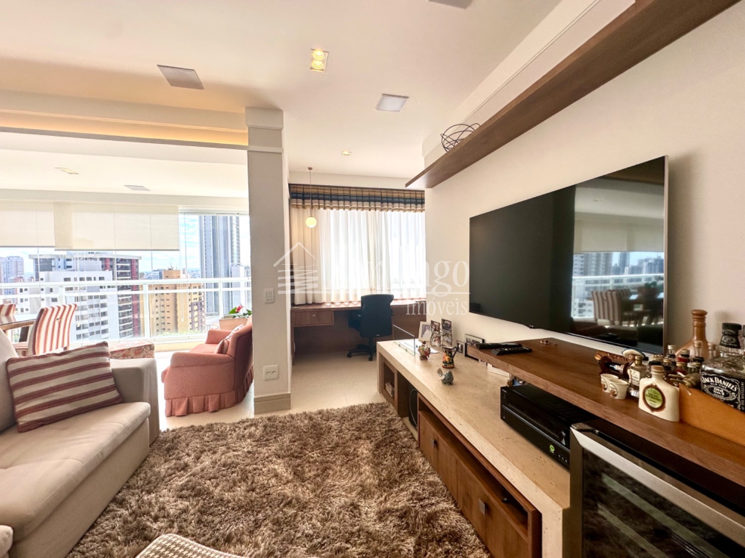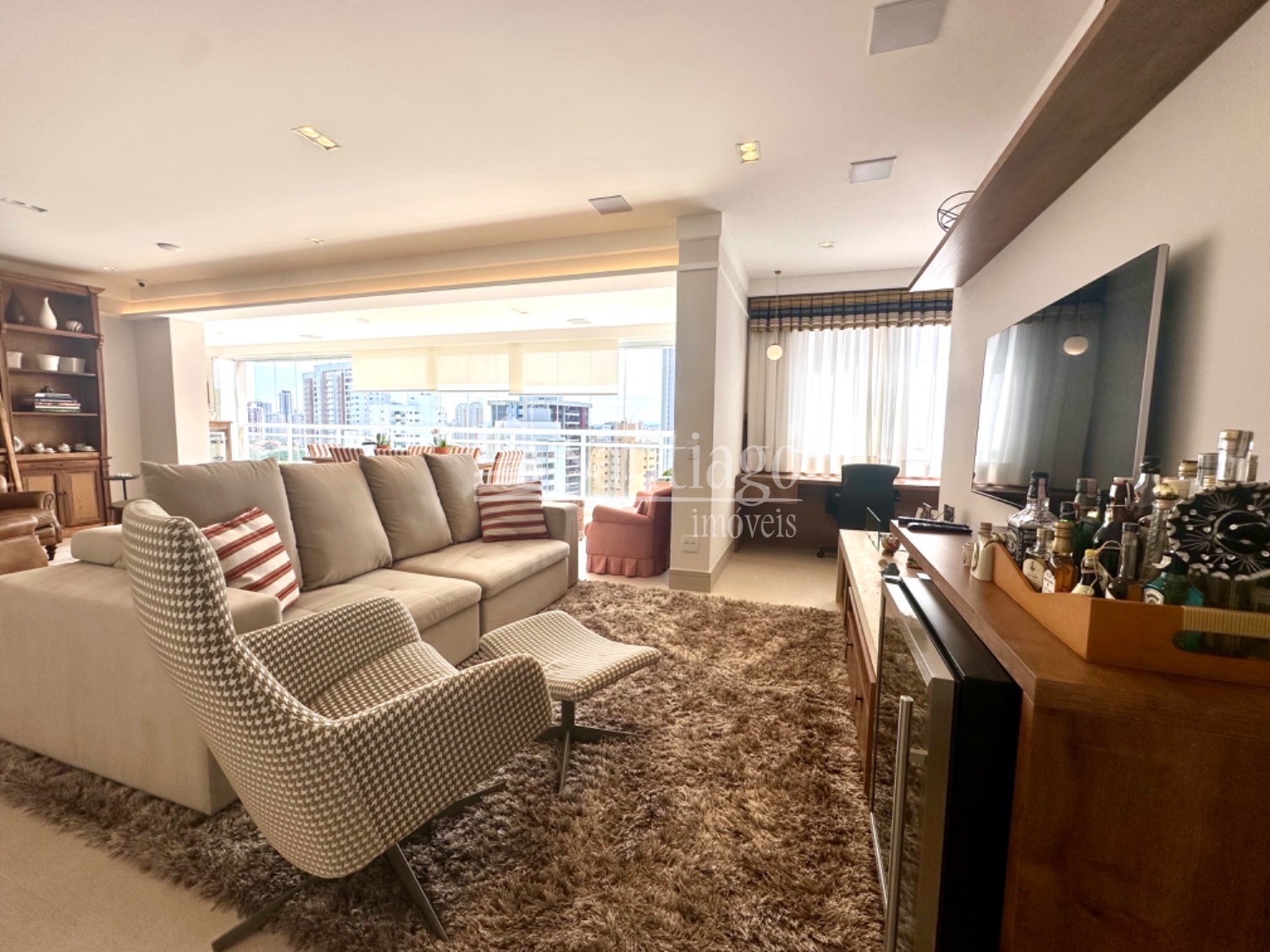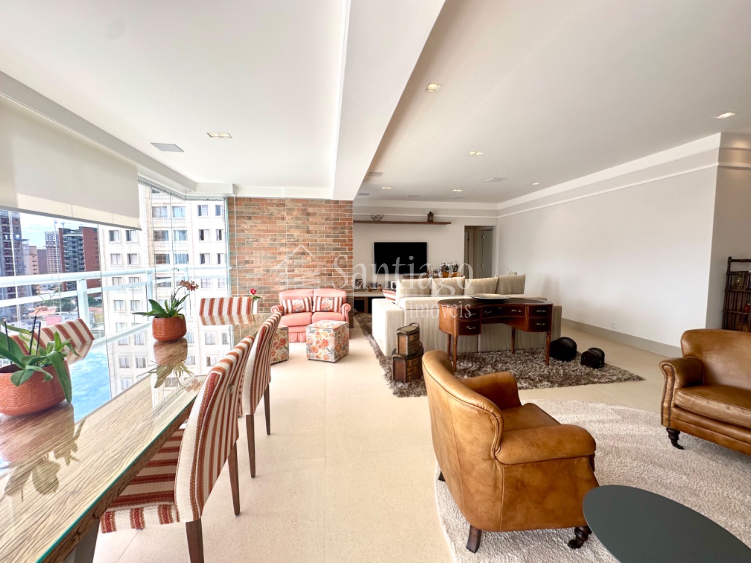 A área gourmet integrada ao living é um dos pontos altos deste apartamento. Com grandes janelas envidraçadas, proporciona uma vista impressionante da cidade, tornando os momentos de lazer ainda mais especiais.