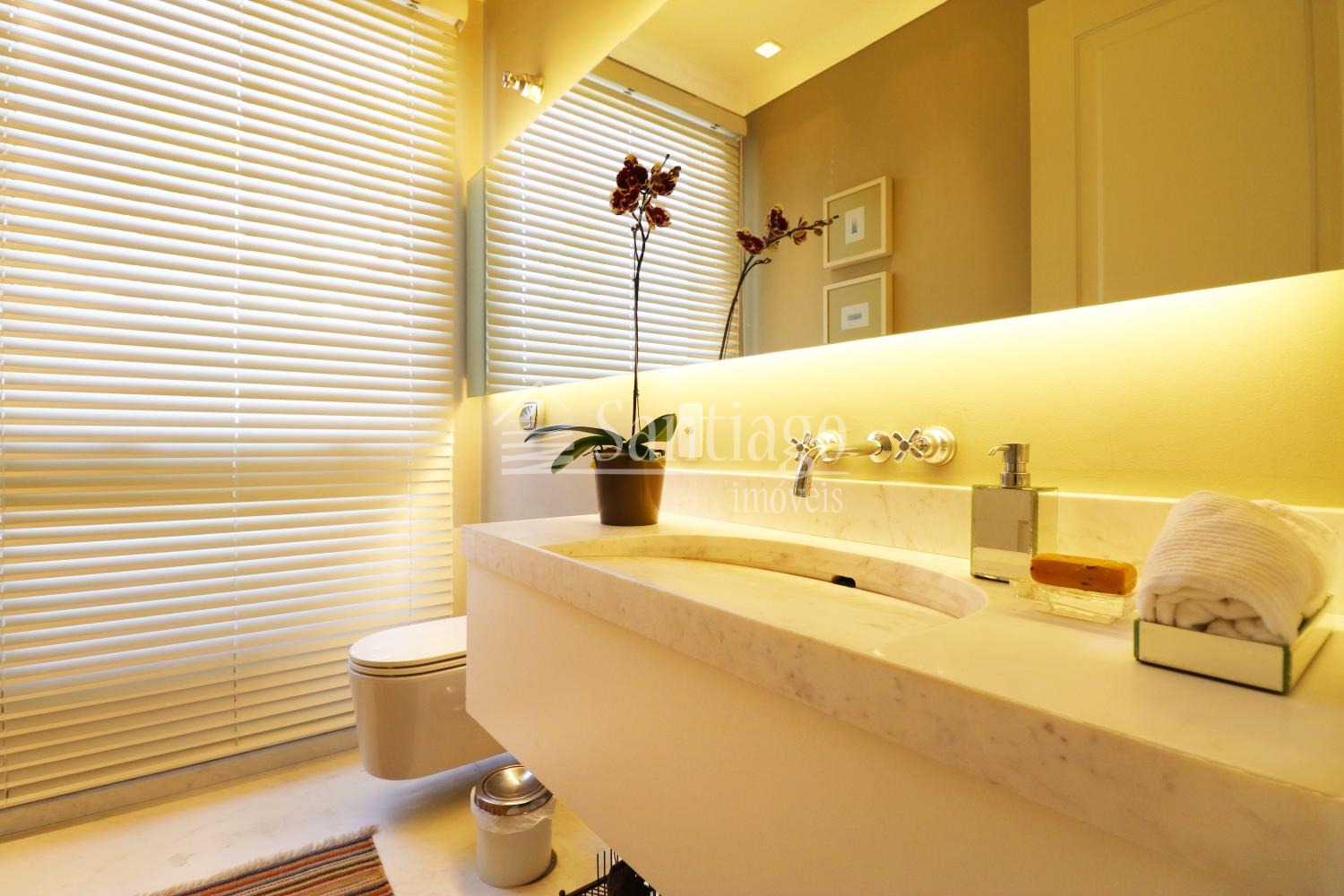 São 4 suítes climatizadas sendo 1 master, sala íntima de tv, generoso living para 4 distintos ambientes, home theater, home office e lavabo, tudo, integrado ao convidativo espaço gourmet e lazer do imóvel, cozinha finamente planejada com despensa e copa de apoio, área de serviço mais dependências de empregados.