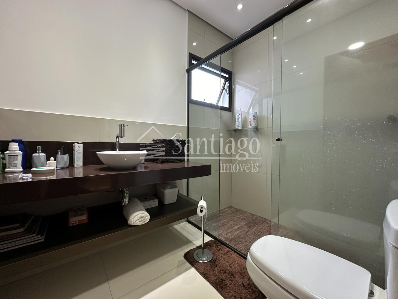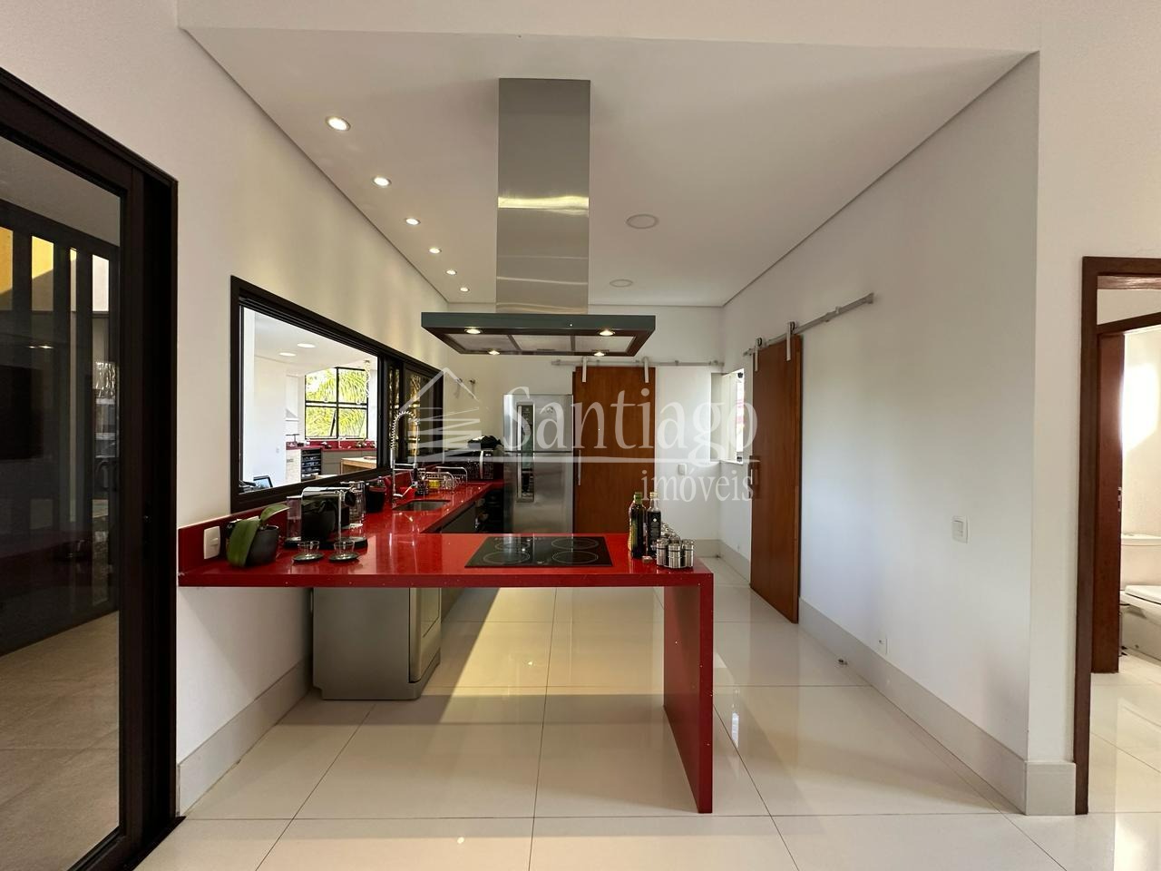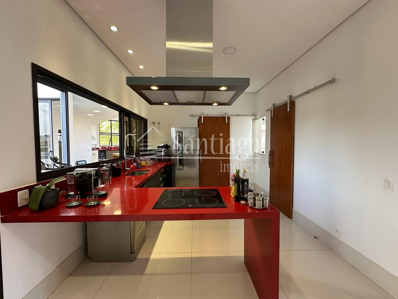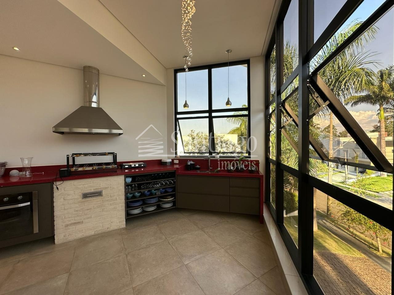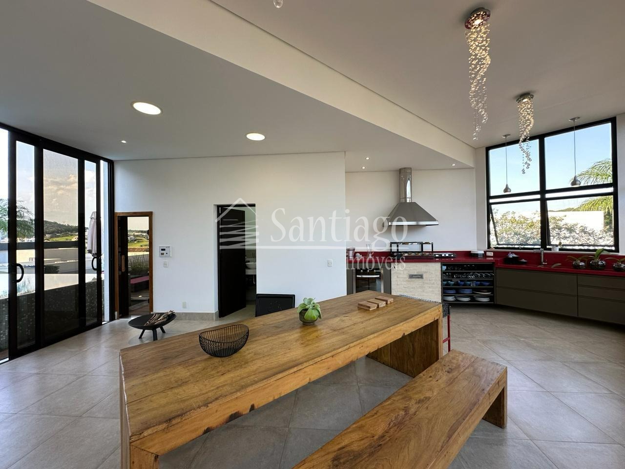 A sala com pé direito duplo e a cozinha gourmet integrada são um destaque, ambos com acabamento premium e armários planejados.
