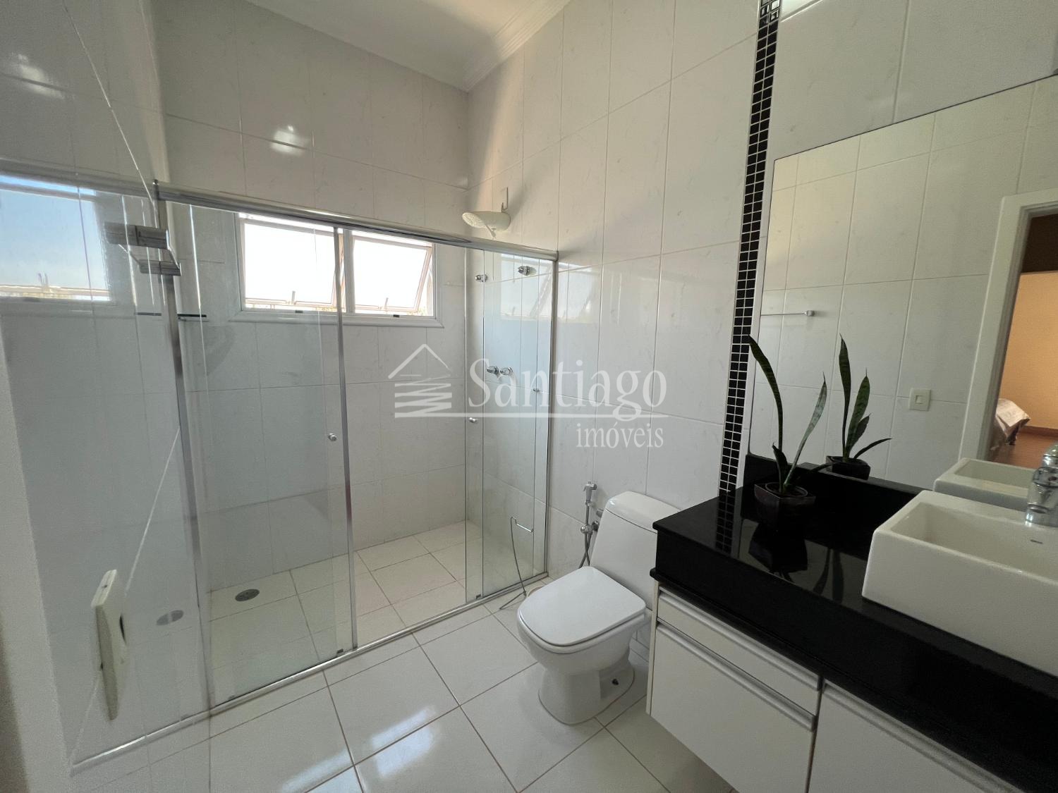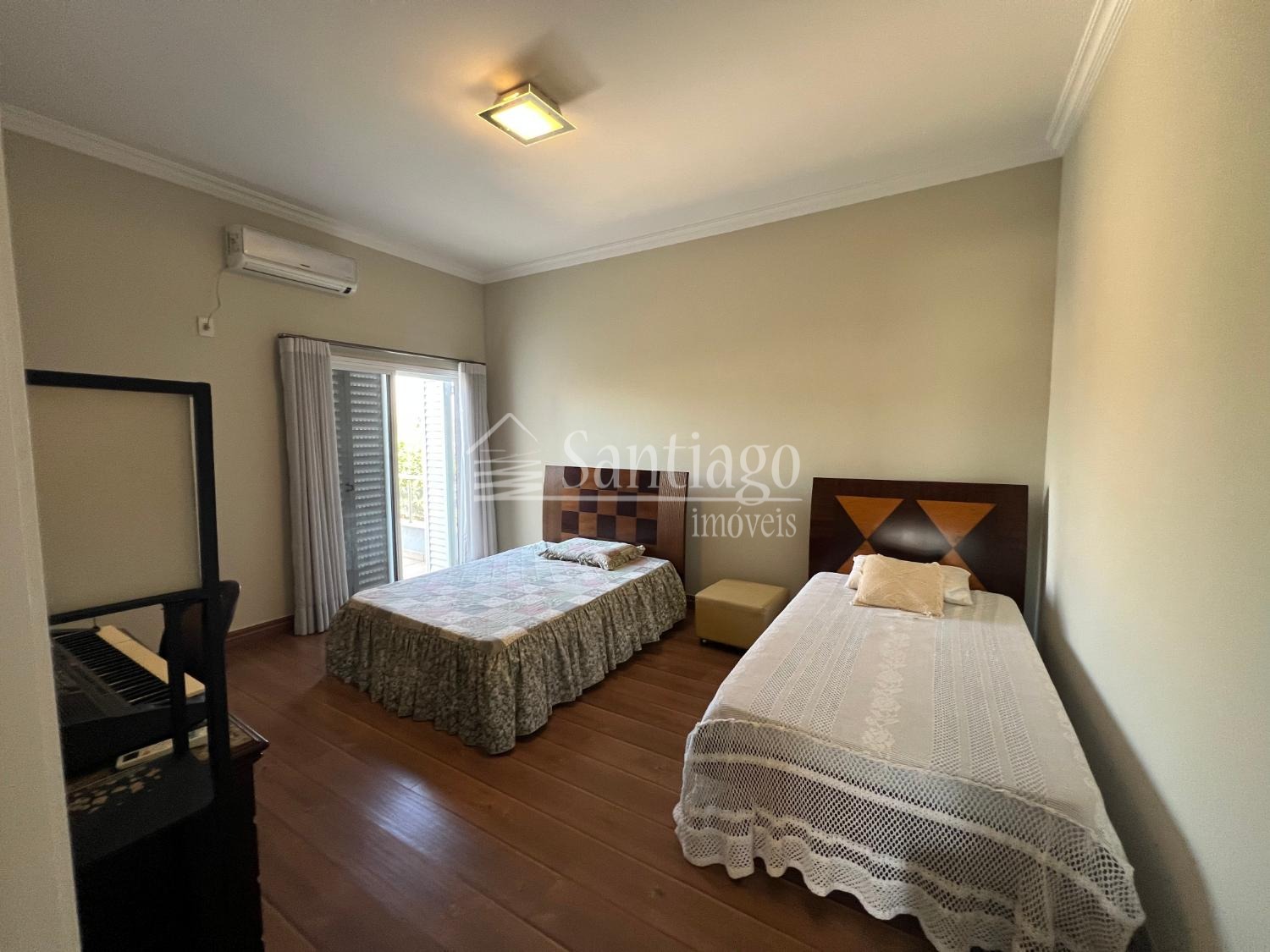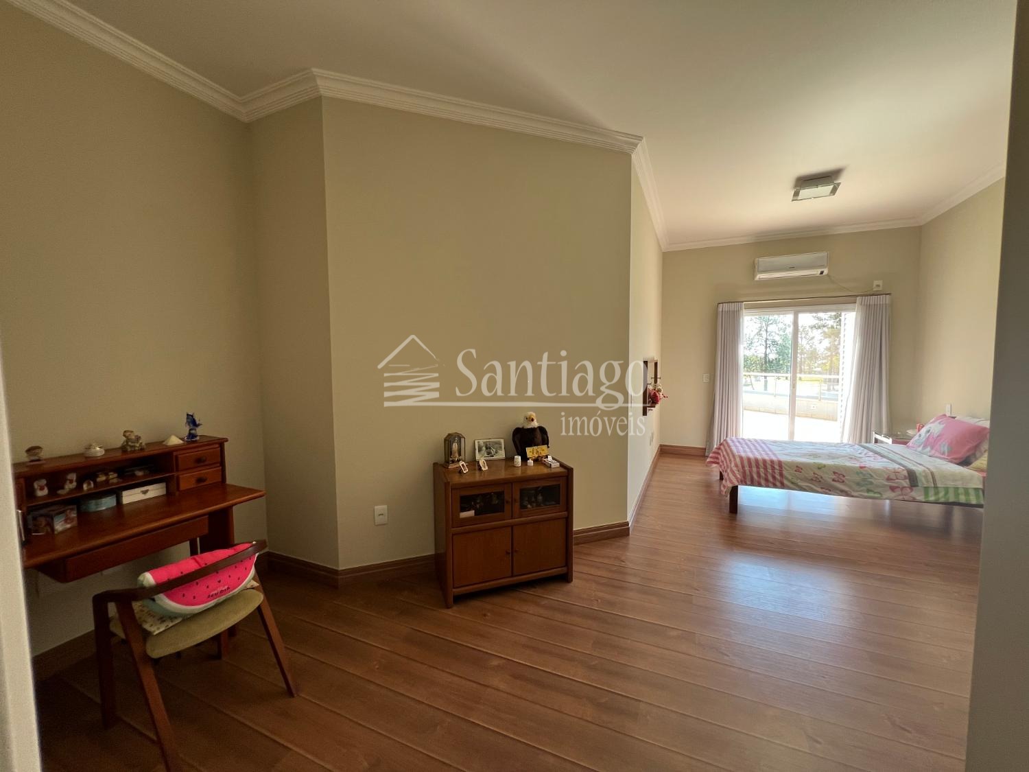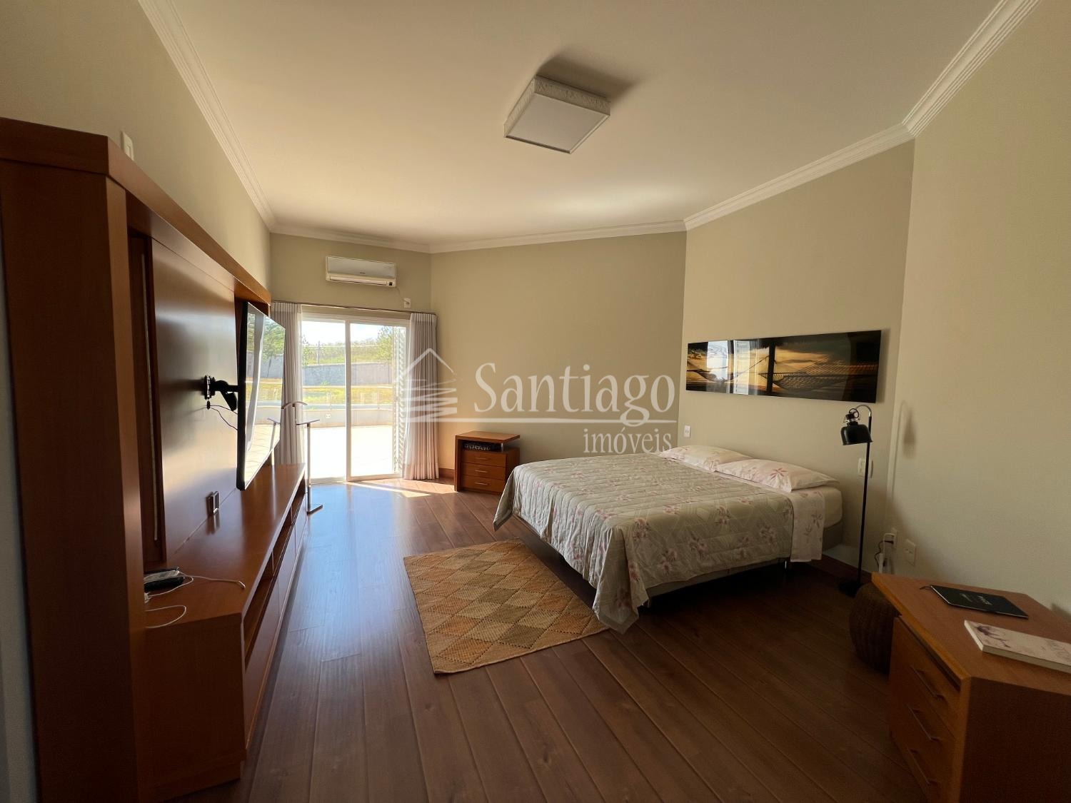 No pavimento superior, quatro suítes amplas, todas com closet e ar-condicionado, incluindo uma master com hidro Jacuzzi. No piso térreo, uma suíte adaptada com varanda, ideal para idosos ou pessoas com necessidades especiais.