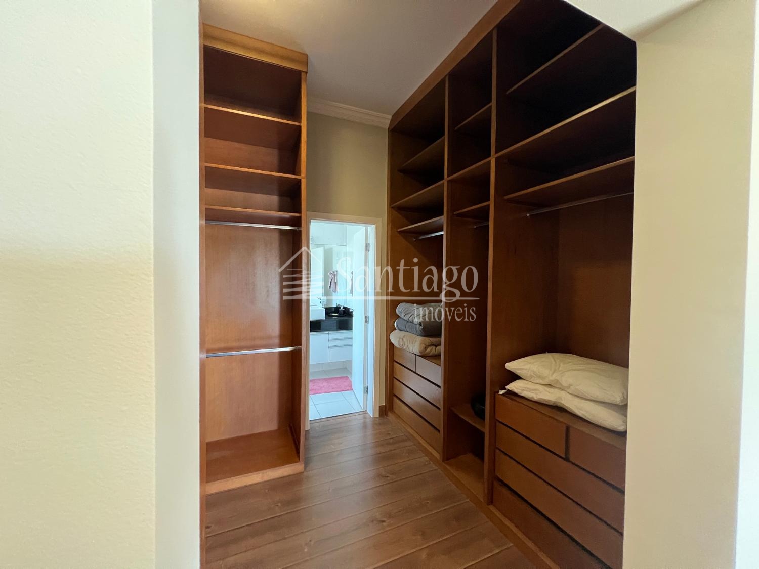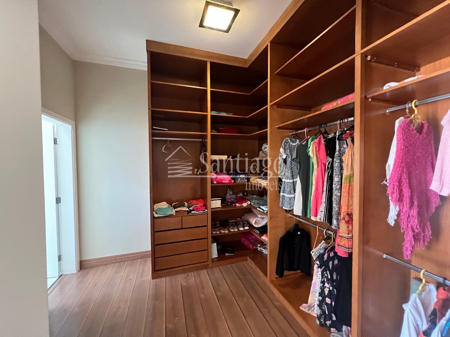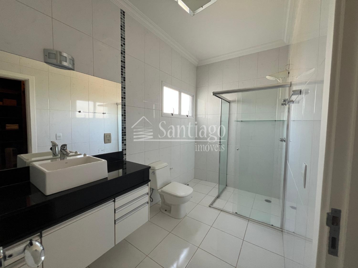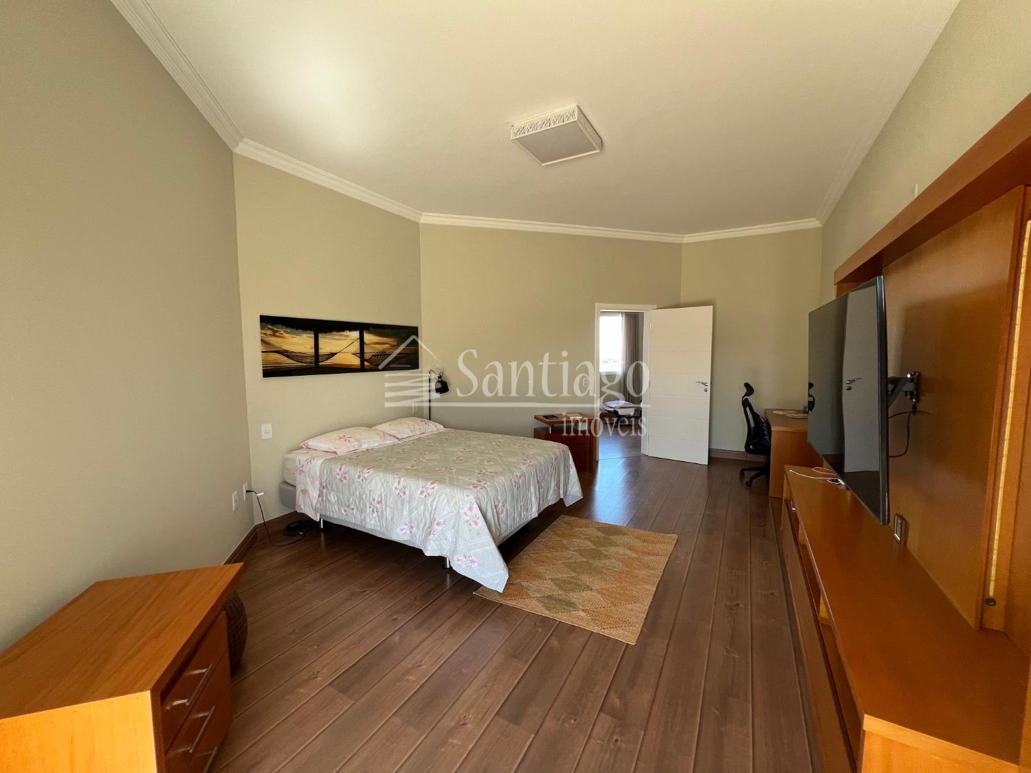 No pavimento superior, quatro suítes amplas, todas com closet e ar-condicionado, incluindo uma master com hidro Jacuzzi. No piso térreo, uma suíte adaptada com varanda, ideal para idosos ou pessoas com necessidades especiais.