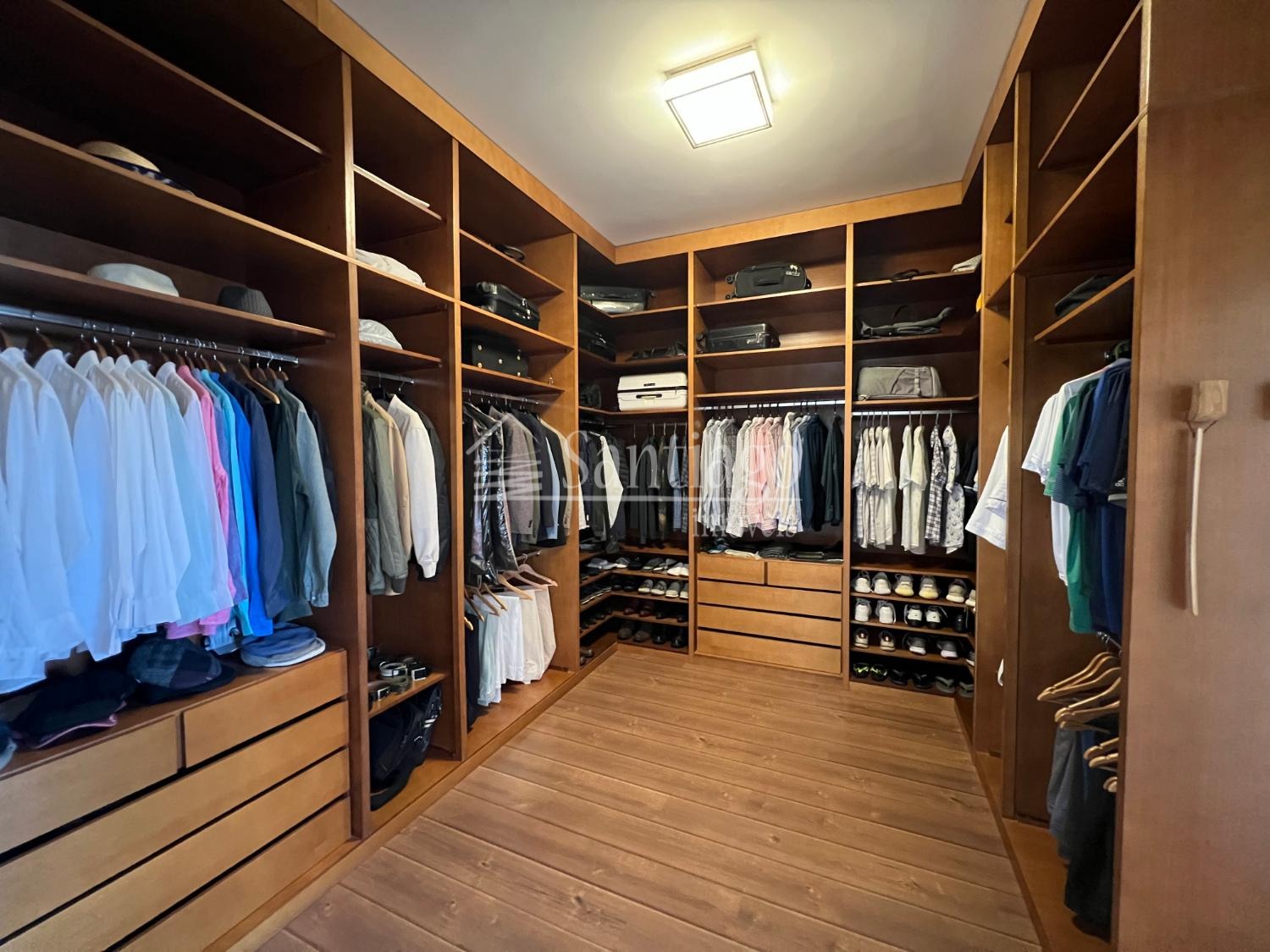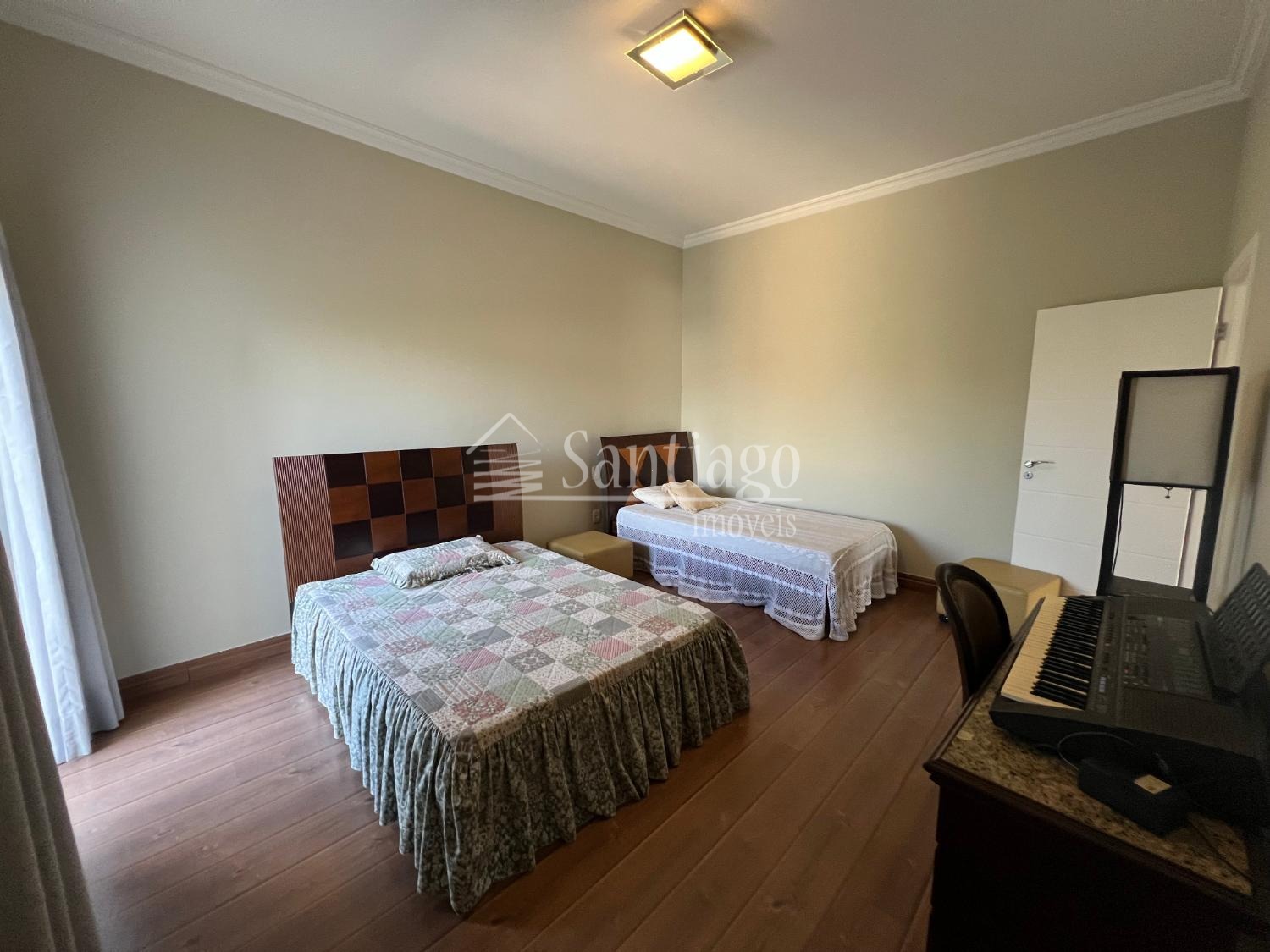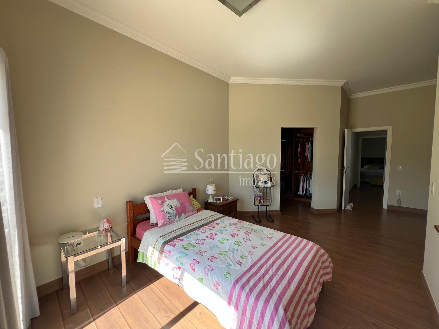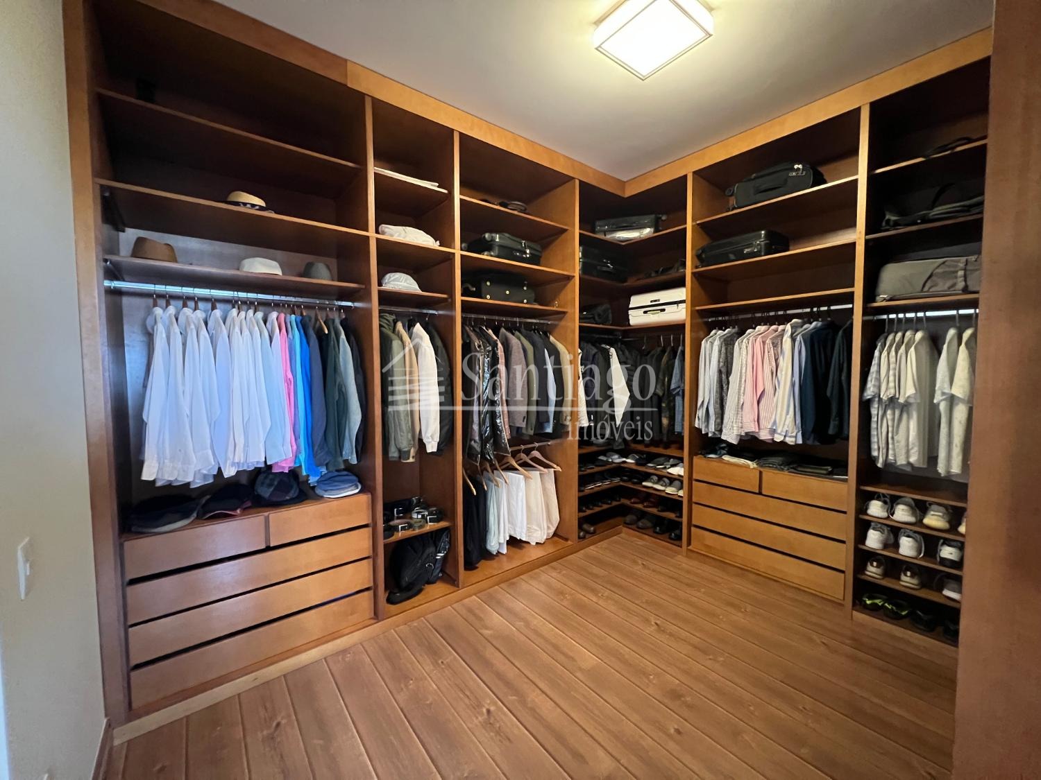 No pavimento superior, quatro suítes amplas, todas com closet e ar-condicionado, incluindo uma master com hidro Jacuzzi. No piso térreo, uma suíte adaptada com varanda, ideal para idosos ou pessoas com necessidades especiais.