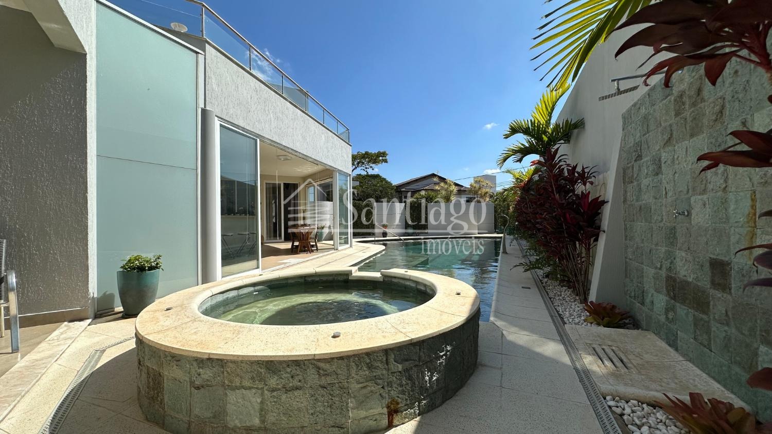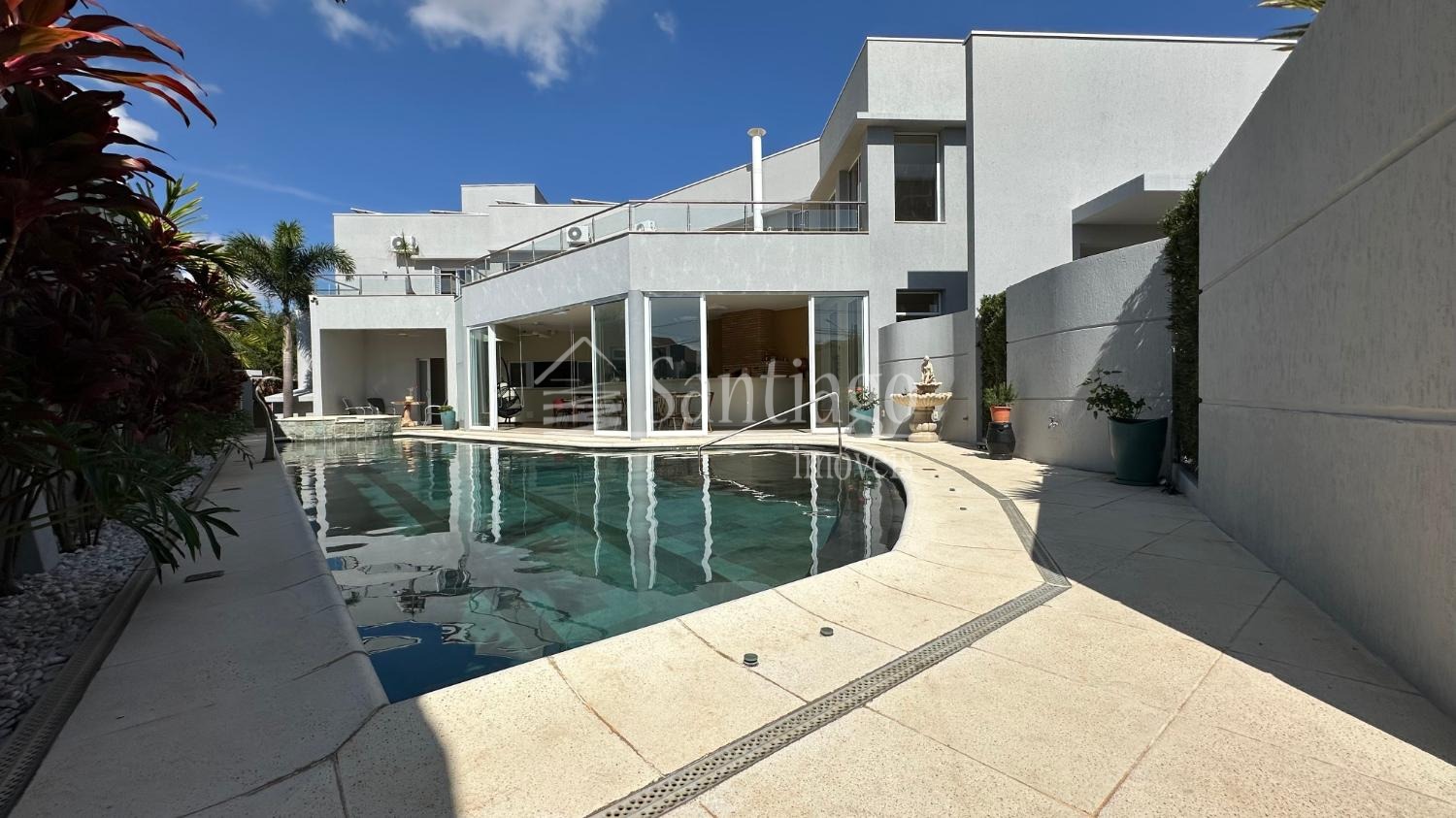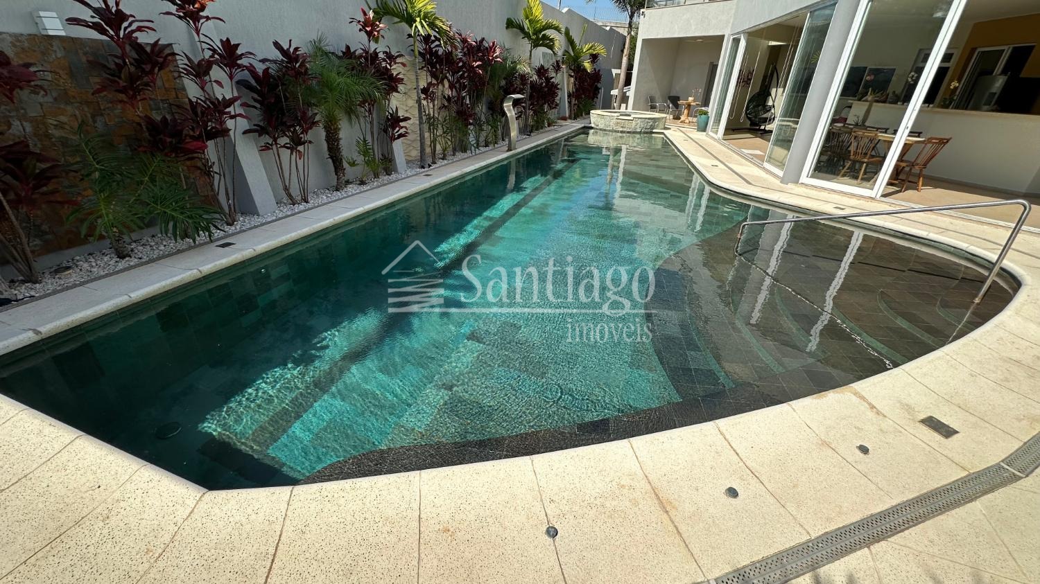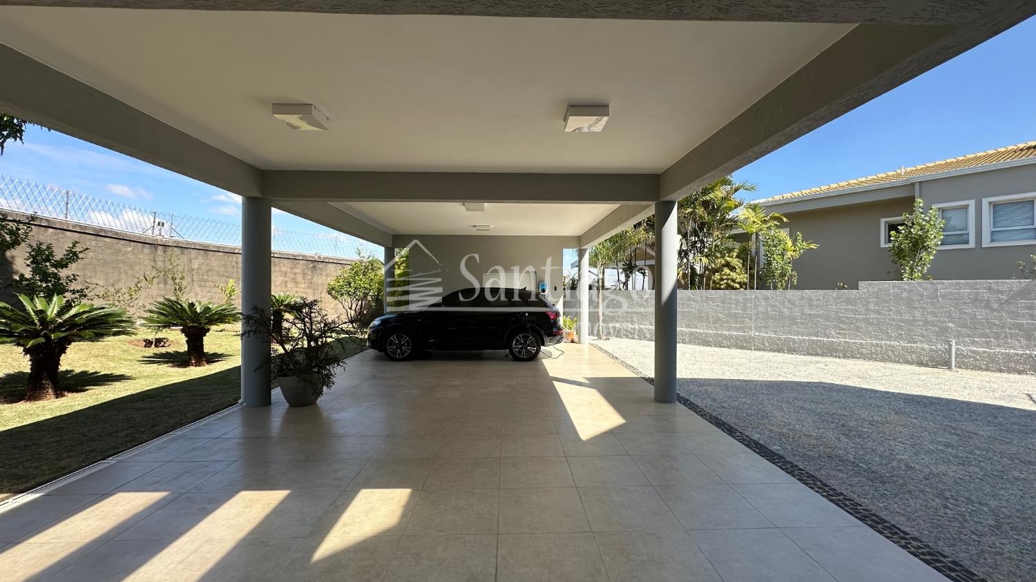 A arquitetura moderna se destaca pela fachada imponente, ladeada por espelho d’água e cachoeira, com paisagismo exuberante e acesso privativo para veículos. A garagem coberta acomoda confortavelmente quatro automóveis, com portão eletrônico em alumínio.