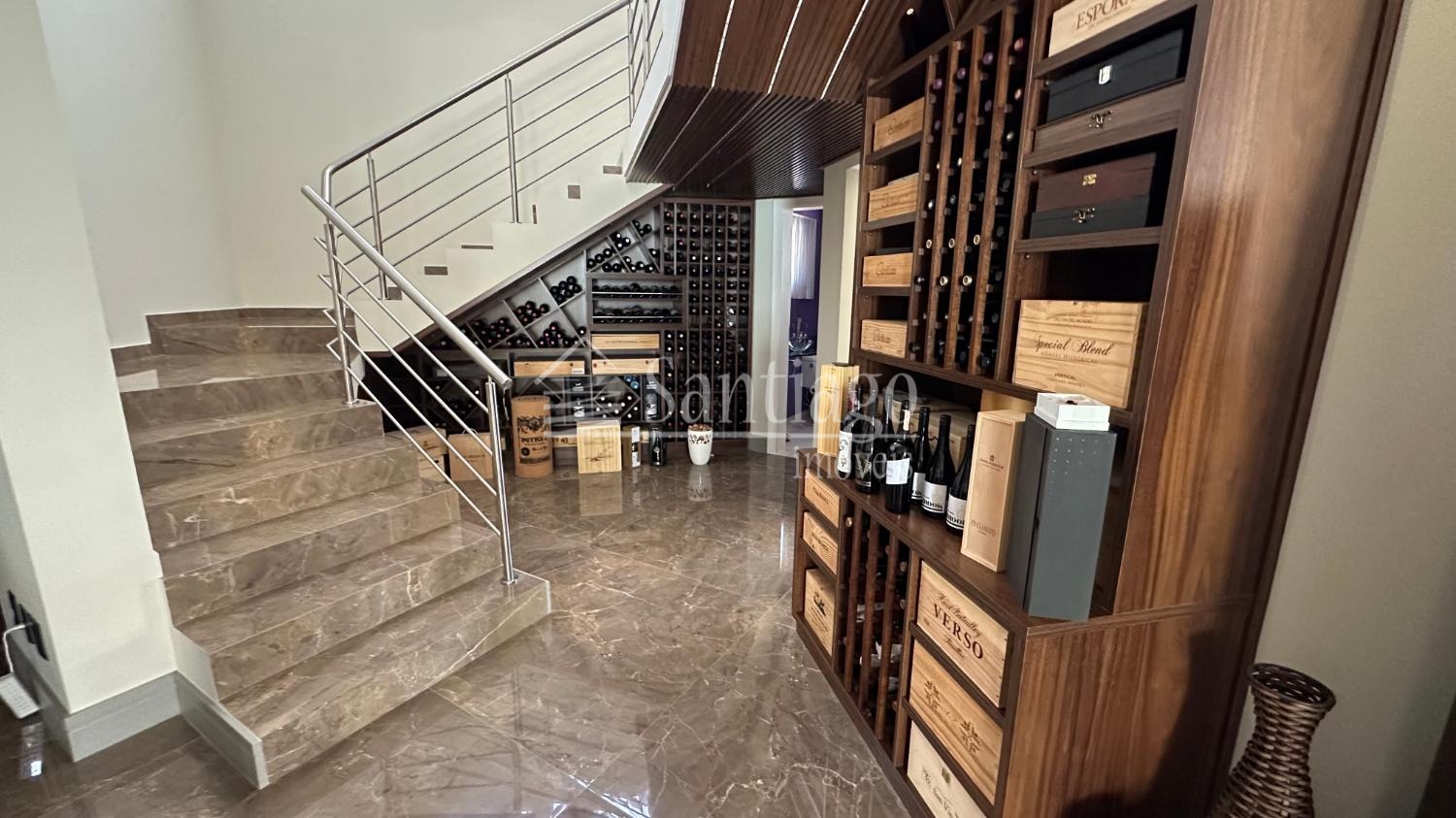 O living de entrada conta com lareira central, ambientes integrados e áreas sociais generosas: ampla sala de estar, sala de jantar para 10 ou mais pessoas, e um espaço exclusivo para adegas profissionais, climatizadas para vinhos tintos, brancos e espumantes, além de área para destilados, comportando aproximadamente 1.200 garrafas.