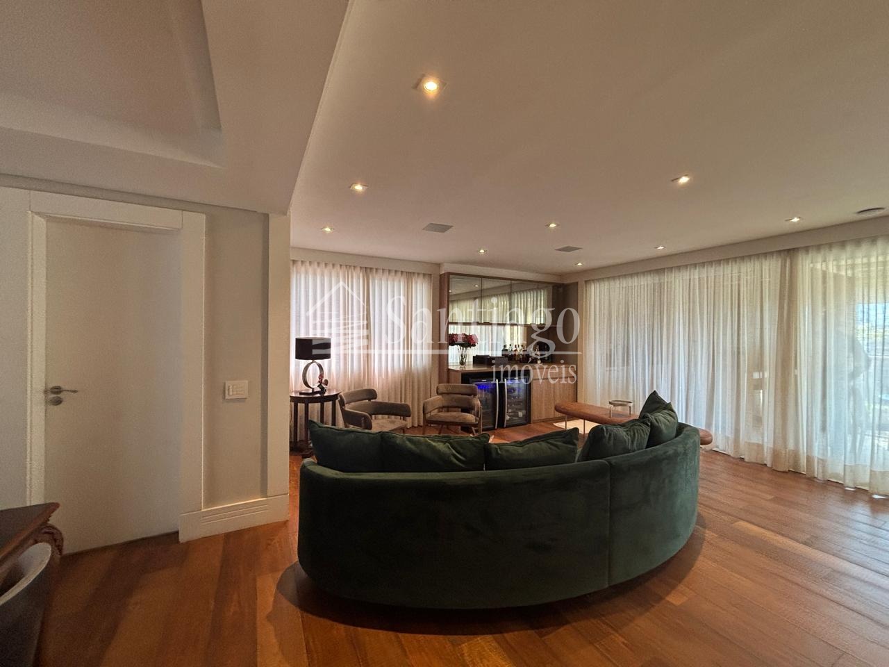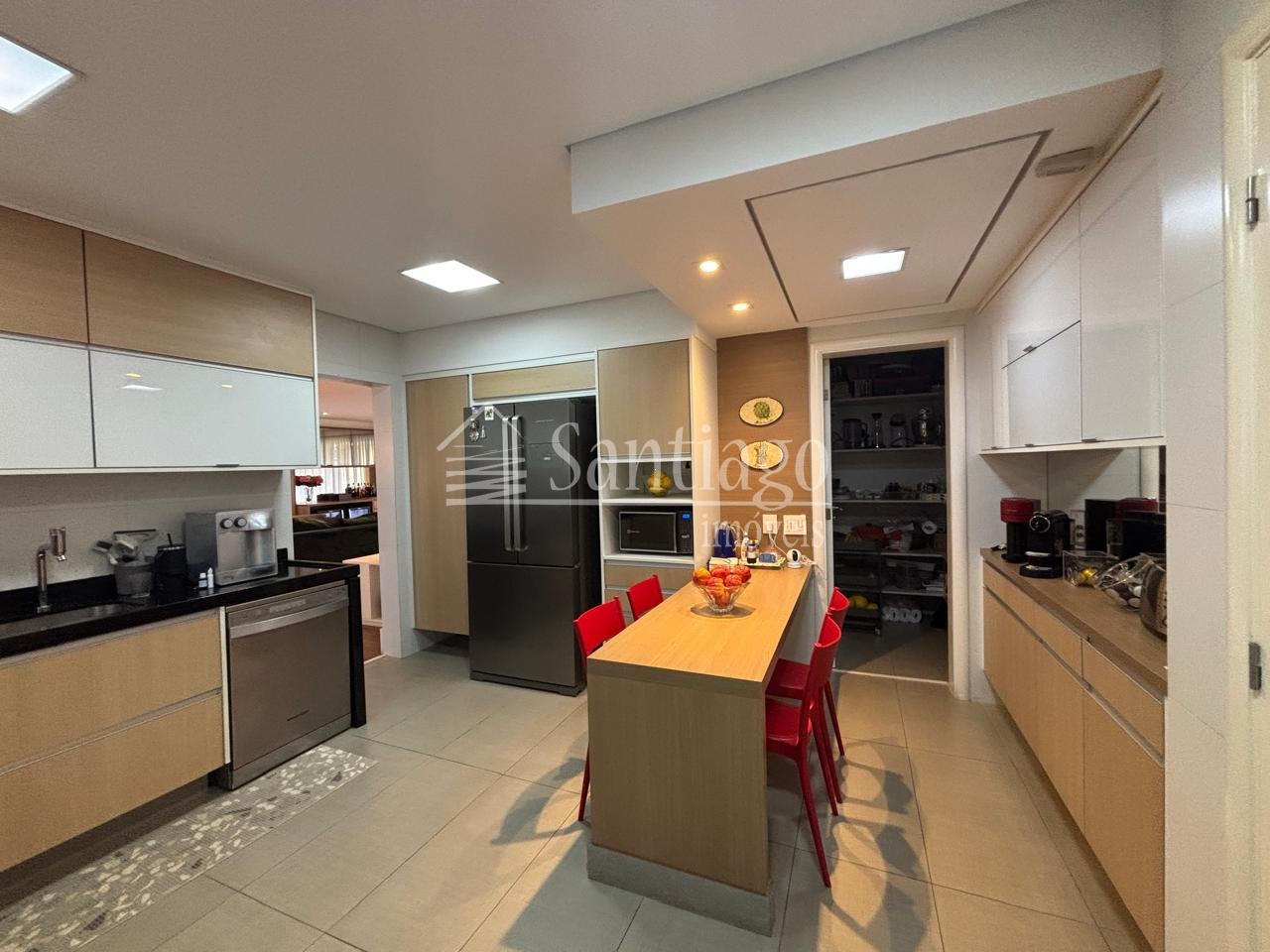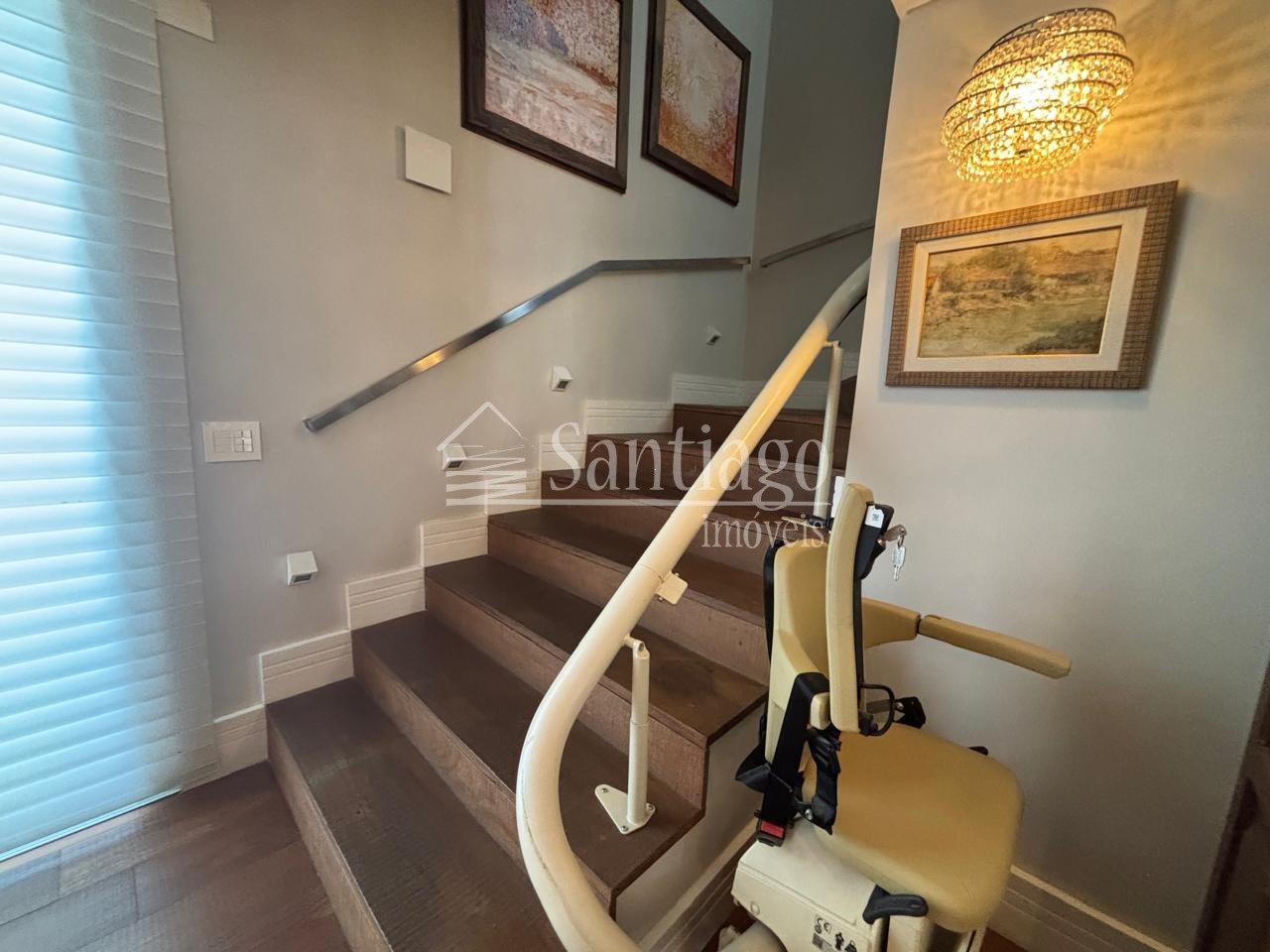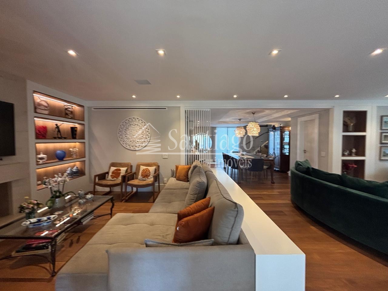 Living para 4 distintos ambientes, lavabo, lareira e ar condicionado central, tudo integrado ao espaço gourmet e uma convidativa piscina, cadeira motorizada para acesso ao piso superior, cozinha finamente planejada e despensa, área de serviço com dependência completa de empregada. 5 vagas de garagens paralelas. Agende sua visita com Santiago Imóveis!
